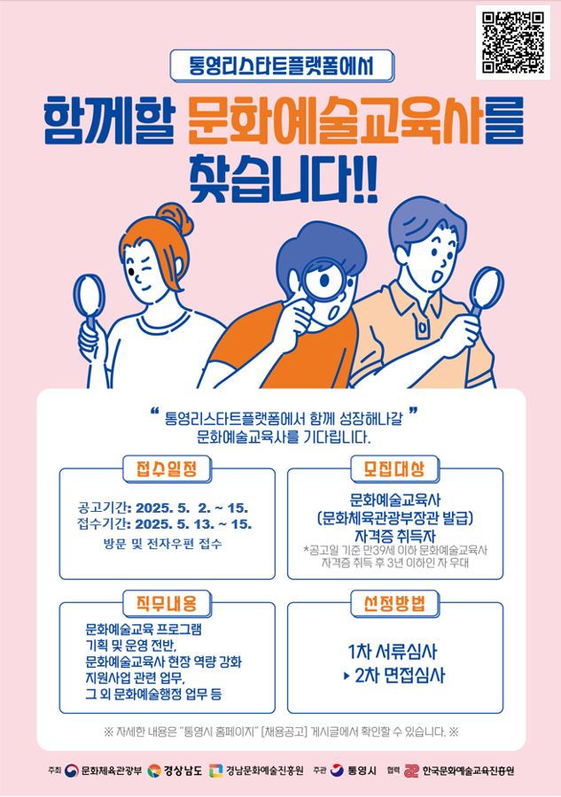 통영시에서는 「2025 문화예술교육사 현장 역량 강화 지원사업」의 일환으로 신진 교육사의 실무 역량 제고 및 문화예술교육프로그램 운영을 통한 공공문화시설 활성화를 추진하고자 붙임과 같이 문화예술교육사 채용을 재공고하오니 역량있는 분들의 많은 신청 바랍니다.