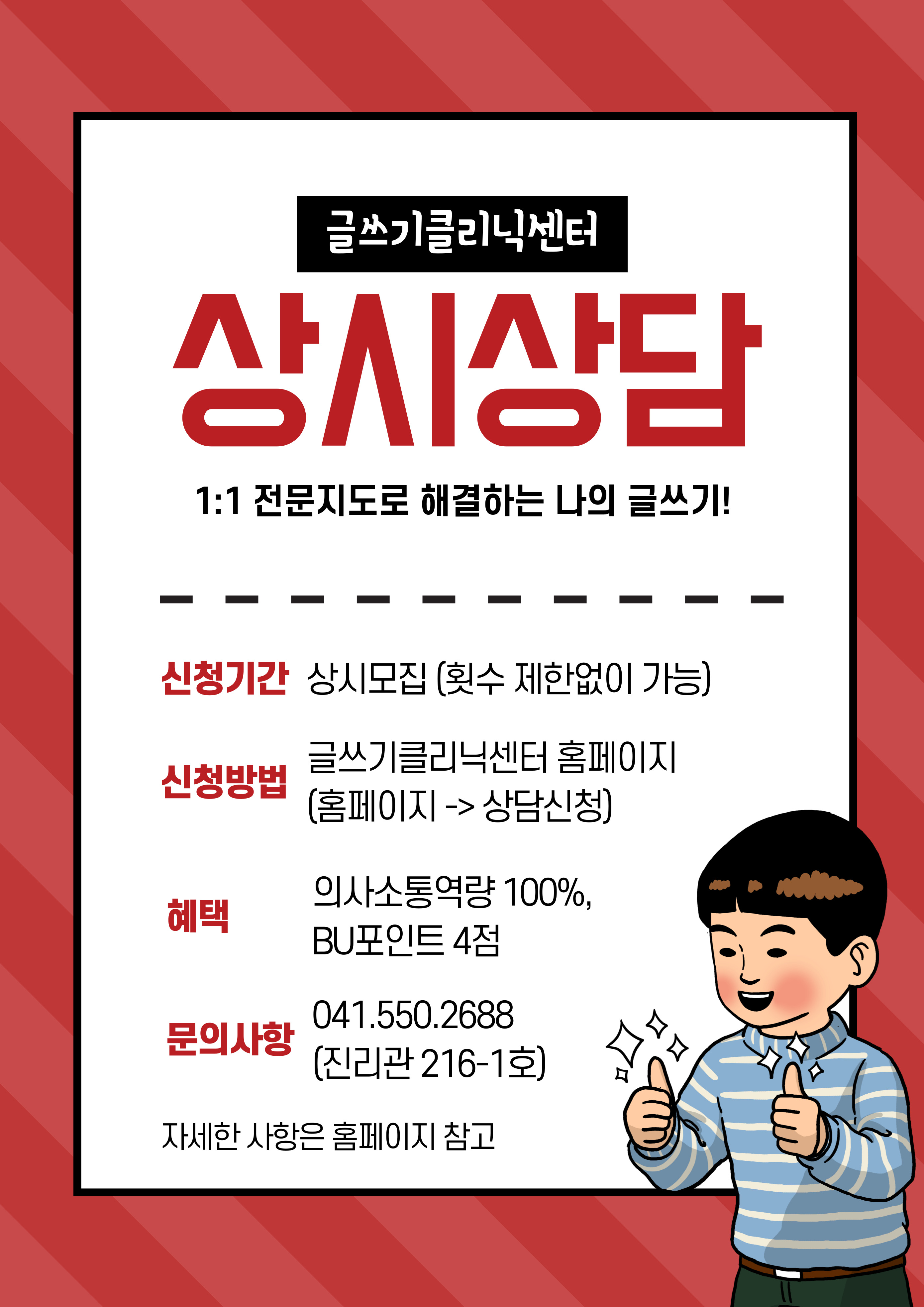 ▶ 신청방법: 글쓰기클리닉센터 홈페이지 → 글쓰기상담 배너 '바로가기' 클릭 → 구글폼 작성