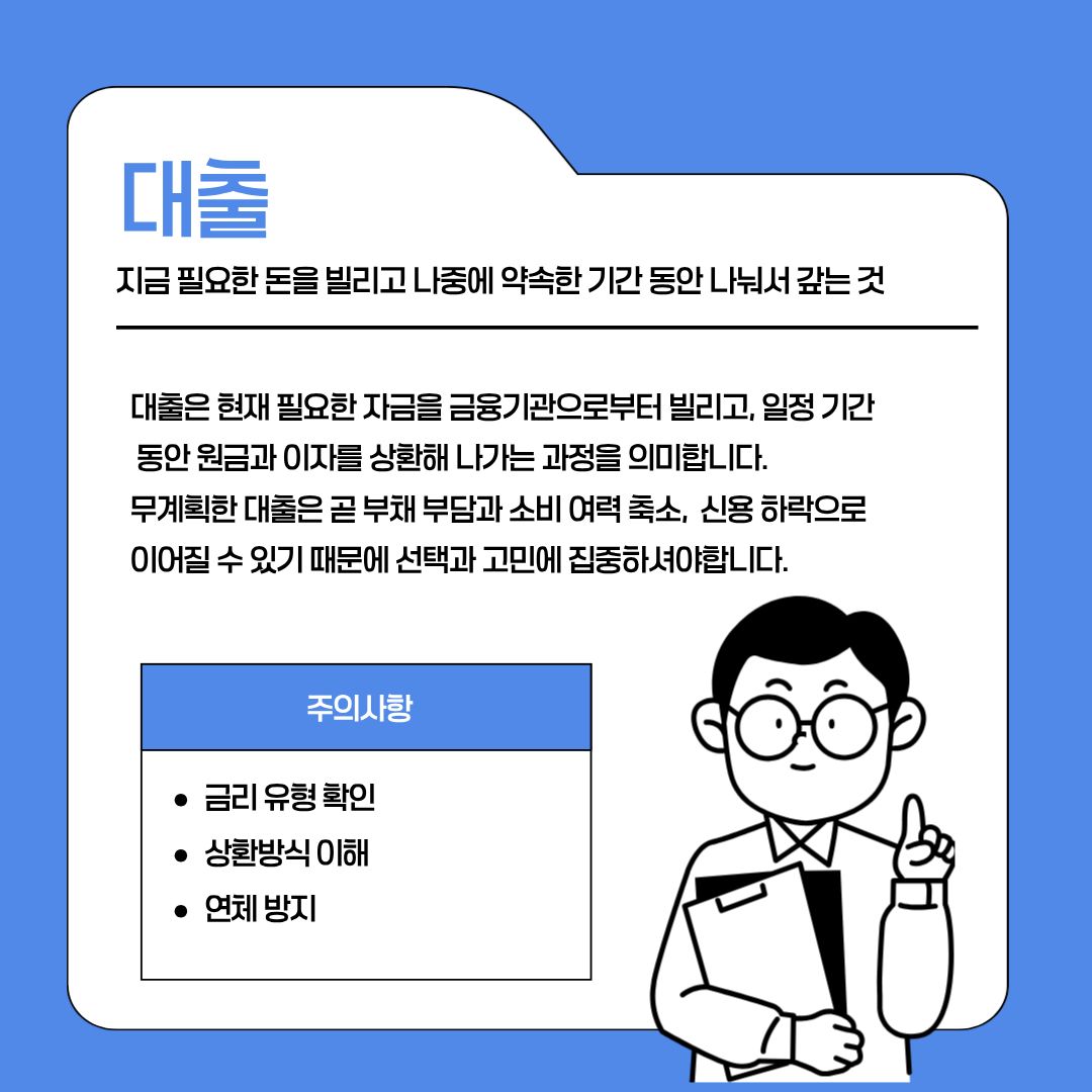 대출은 현재 필요한 자금을 금융기관으로부터 빌리고, 일정 기간 동안 원금과 이자를 상환해 나가는 과정을 의미합니다. 이 개념은 단순히 돈을 빌린다는 표현 보다는 개인이 미래의 소득을 미리 당겨 쓰는 경제적 선택에 의미를 더 두셔야합니다. 대학생에게 익숙한 예로는 국가장학재단의 학자금 대출이 있습니다. 등록금과 생활비가 당장 필요하지만 소득이 충분하지 않은 경우, 미래에 벌게 될 소득을 전제로 현재 비용을 해결하는 것이죠. 또 대출은 상황에 따라 신용대출, 담보대출, 보증대출 등 다양한 형태로 구분됩니다. 예를 들어, 신용대출은 개인의 신용점수를 바탕으로 이루어지는 대출이고, 담보대출은 부동산이나 보증금 같은 자산을 담보로 맡기고 빌리는 대출입니다. 이때 가장 중요한 것은 대출은 돈을 받는 행위가 아니라, 그 돈을 갚아갈 미래의 경제 계획이 함께 수반되는 것이라는 점입니다. 무계획한 대출은 곧 부채 부담과 소비 여력 축소, 더 나아가 신용 하락으로 이어질 수 있기 때문에 선택과 고민에 집중하셔야합니다.
