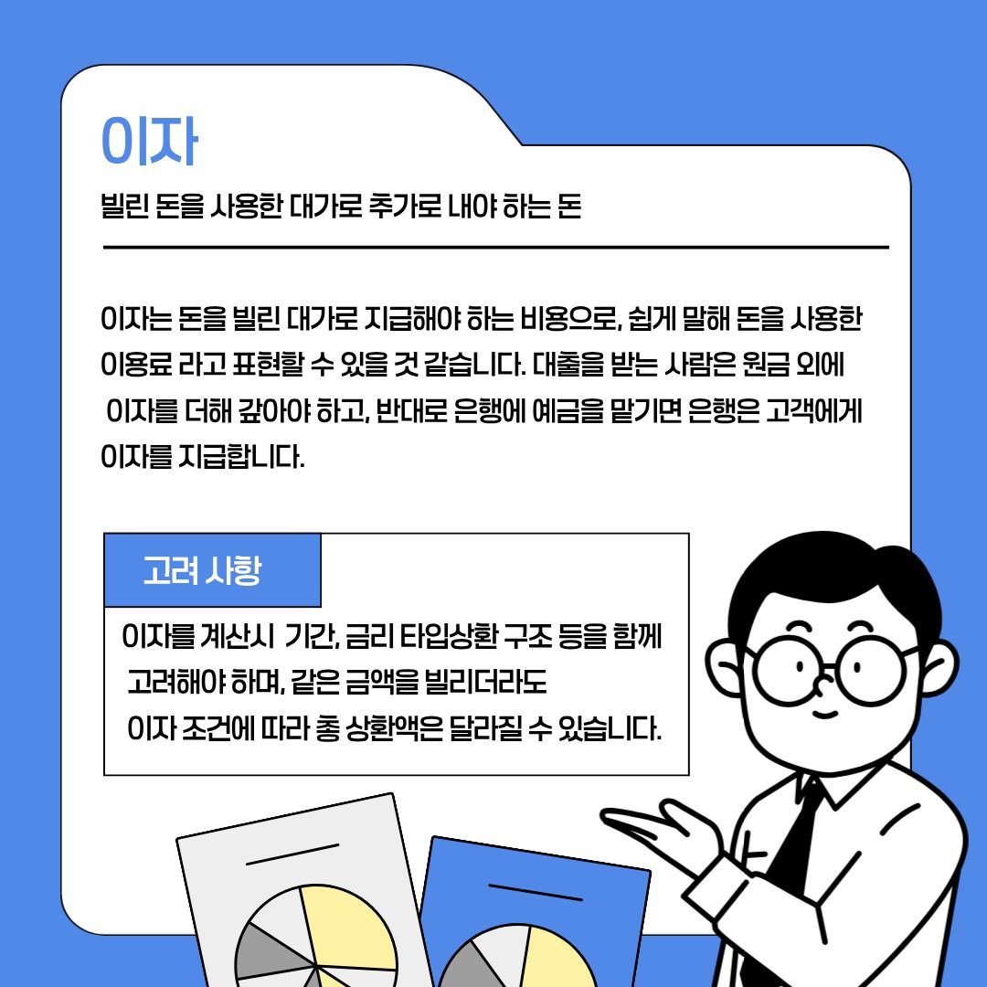 이자는 돈을 빌린 대가로 지급해야 하는 비용으로, 쉽게 말해 돈을 사용한 이용료 라고 이해할 수 있을 것 같습니다. 대출을 받는 사람은 원금 외에 이자를 더해 갚아야 하고, 반대로 은행에 예금을 맡기면 은행은 고객에게 이자를 지급합니다. 이는 돈에도 시간적 가치가 존재한다는 금융의 핵심 원리를 반영합니다. 예를 들어 100만원을 빌리고 이자율이 5%라면, 1년 뒤 갚아야 하는 이자는 5만원입니다. 하지만 실생활에서는 이자가 복리로 쌓이거나 변동금리에 의해 달라지는 등 훨씬 더 유연하게 변합니다. 따라서 이자를 계산할 때는 기간, 금리 타입(고정/변동), 상환 구조 등을 함께 고려해야 하며, 같은 금액을 빌리더라도 이자 조건에 따라 총 상환액은 크게 달라질 수 있습니다. 이자는 단순한 숫자를 넘어서 소비와 저축의 균형을 결정하고, 개인의 경제적 선택을 좌우하는 중요한 지표입니다.