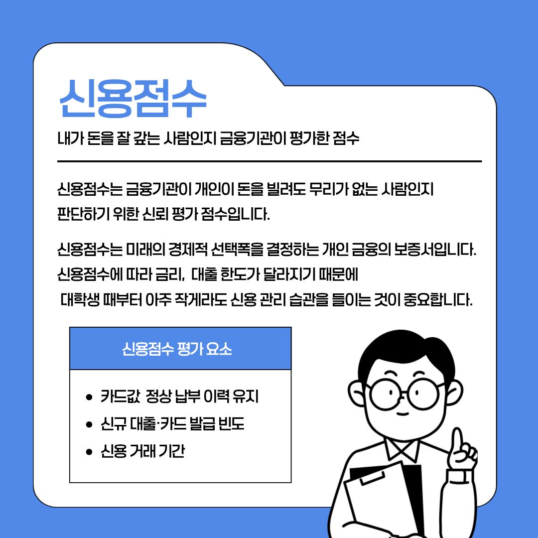 신용점수는 금융기관이 개인이 돈을 빌려도 무리가 없는 사람인지 판단하기 위한 신뢰 평가 점수입니다. 이 점수는 카드값을 제때 납부했는지, 휴대폰 요금을 연체한 적은 없는지, 체크카드 사용이 꾸준한지 등 일상적인 생활습관을 매우 세밀하게 반영하여 측정됩니다. 신용점수에 따라 대출 시 적용되는 금리와 대출한도가 달라지기도 합니다. 신용점수가 높으면 낮은 금리로 대출이 가능하며 대출 한도가 넓어지기도 하며 주거, 전세자금, 자동차 리스 등 선택지가 다양해집니다. 신용점수가 낮으면 대출 승인 자체가 어려워지거나 이자가 훨씬 높은 대출만 이용 가능하게 됩니다. 즉, 신용점수는 미래의 경제적 선택폭을 결정하는 개인 금융의 보증서라고 표현할 수 도 있을 것 같습니다. 대학생 때부터 아주 작게라도 신용 관리 습관을 들이는 것이 중요합니다.