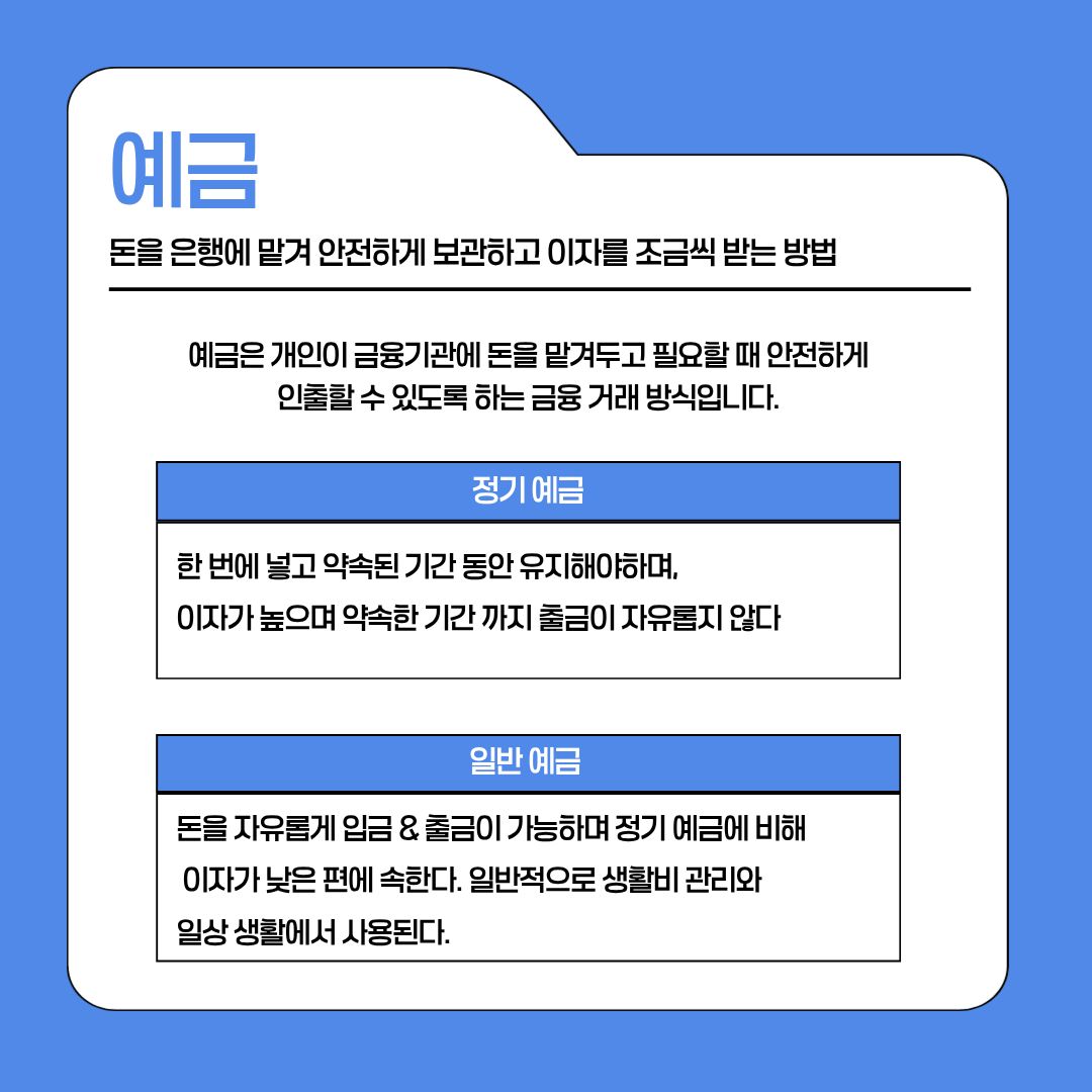예금은 개인이 금융기관에 돈을 맡겨두고 필요할 때 안전하게 인출할 수 있도록 하는 금융 거래 방식입니다. 예금은 크게 입출금이 자유로운 예금과 정해진 기간 동안 돈을 맡기고 이자를 받는 정기예금으로 나뉩니다. 예금은 단순히 돈을 보관하는 것이 아니라, 현재의 소득을 손실 위험 없이 보존하며 미래를 계획하는 자산 관리의 기본 단계라는 의미를 지니고 있습니다.