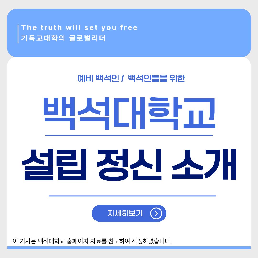 최근 2026학년도 대학 입시에서 백석대학교는 현재 일정 전형에 대하여 조기발표가 이루어졌다는 소식을 접하게 되었습니다. 최근 들어 입시 결과가 속속 발표되고 있다는 이야기도 함께 들려오며, 그만큼 많은 수험생분들이 긴장과 기대 속에서 하루하루를 보내고 계실 것이라 생각됩니다. 오늘은 백석대학교 입시를 준비하시는 분인 예비 백석인 분들께 백석대학교의 설립 정신에 대해 정보를 공유해드려 학교에 대하여 소개하는 시간을 가질 수 있도록 기사를 준비하였습니다. 단순히 합격 여부를 떠나, 앞으로 걸어가게 될 대학이 어떤 가치관과 비전을 바탕으로 운영되고 있는지 아는 것은 매우 중요한 일이기 때문에, 이번 기사를 통해 백석대학교가 가진 뿌리와 철학을 차분히 살펴보는 기회가 되길 바랍니다.