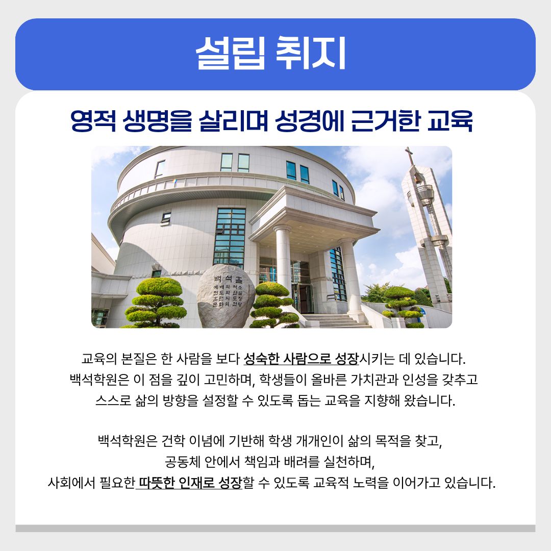특히 인간의 성장을 돕는 과정에서 중요한 것은 지식 이상의 ‘가치와 의미’를 발견하도록 이끄는 것입니다. 백석학원은 건학 이념에 기반해 학생 개개인이 삶의 목적을 찾고, 공동체 안에서 책임과 배려를 실천하며, 사회에서 필요한 따뜻한 인재로 성장할 수 있도록 교육적 노력을 이어가고 있습니다.