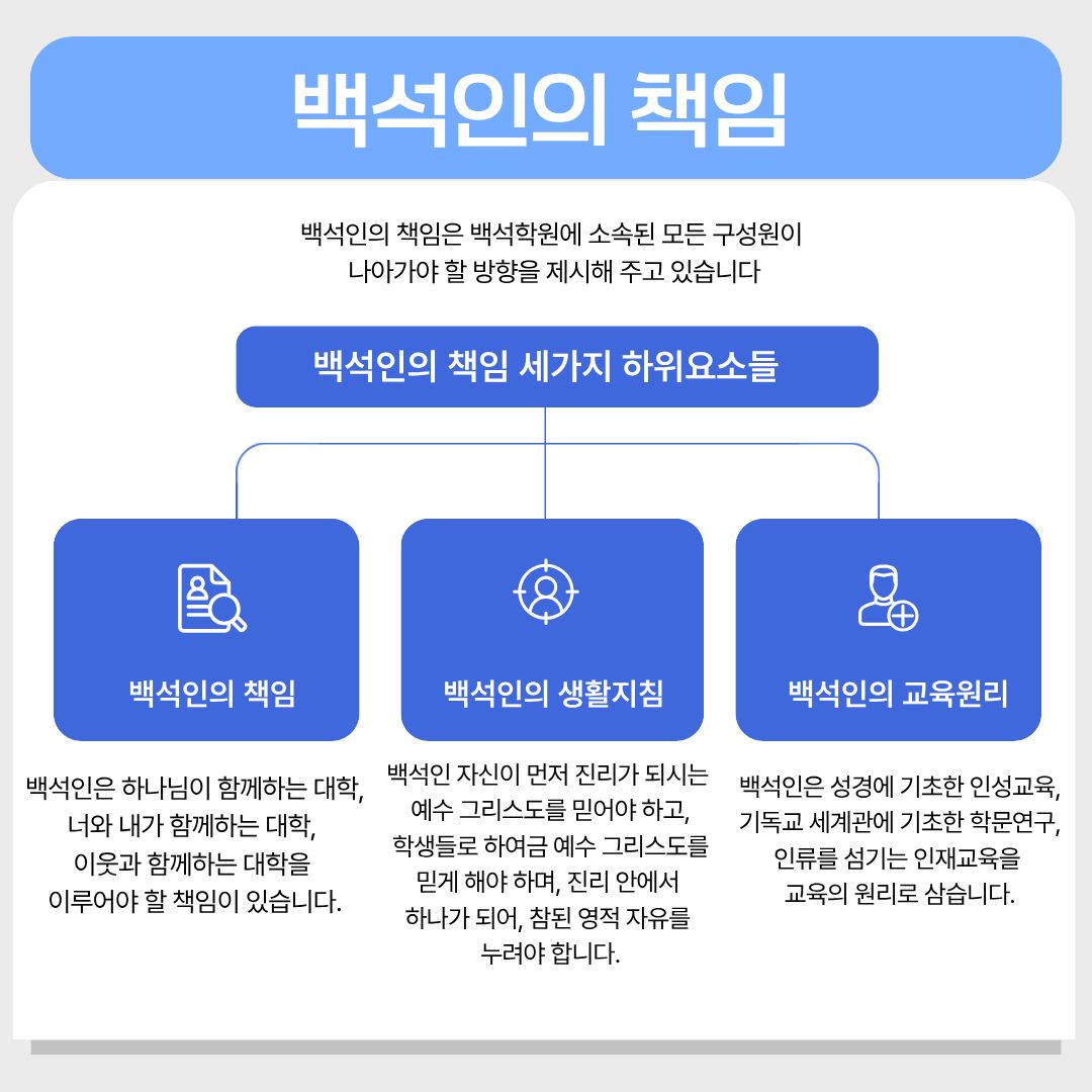 백석인의 책임은 백석학원에 소속된 모든 구성원이 나아가야 할 방향을 제시해 주고 있습니다