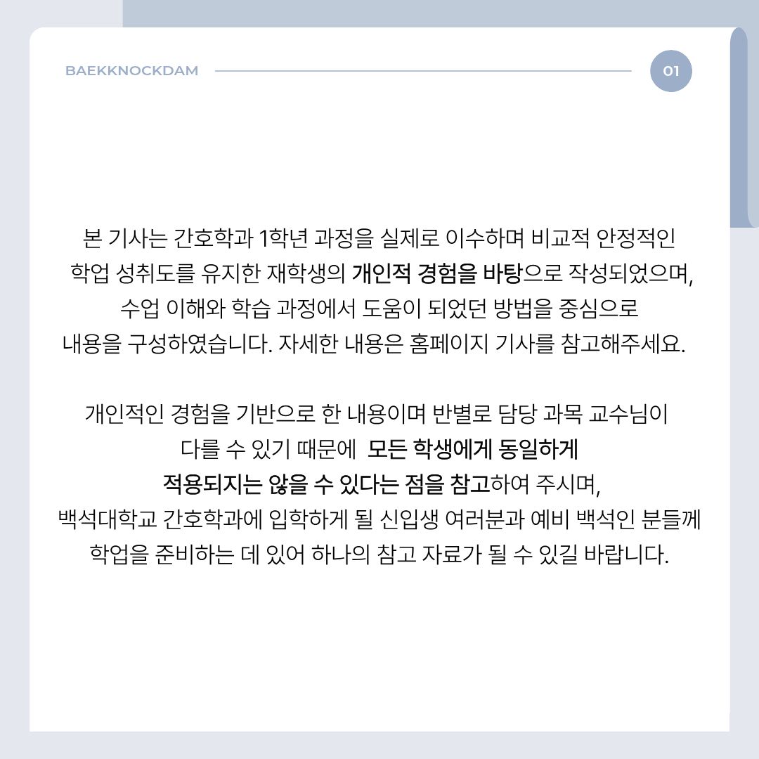 본 기사는 간호학과 1학년 과정을 실제로 이수하며 비교적 안정적인 학업 성취도를 유지한 재학생의 개인적 경험을 바탕으로 작성되었으며, 수업 이해와 학습 과정에서 도움이 되었던 방법을 중심으로 내용을 구성하였습니다. 개인적인 견해로 쓰였다는 점을 참고해주시며 읽어주시길 바랍니다. 개인적인 경험을 기반으로 한 내용이며 담당 과목 교수님이 다를 가능성이 있는 만큼 모든 학생에게 동일하게 적용되지는 않을 수 있으나, 백석대학교 간호학과에 입학하게 될 신입생 여러분께 학업을 준비하는 데 있어 하나의 참고 자료가 될 수 있길 바랍니다.