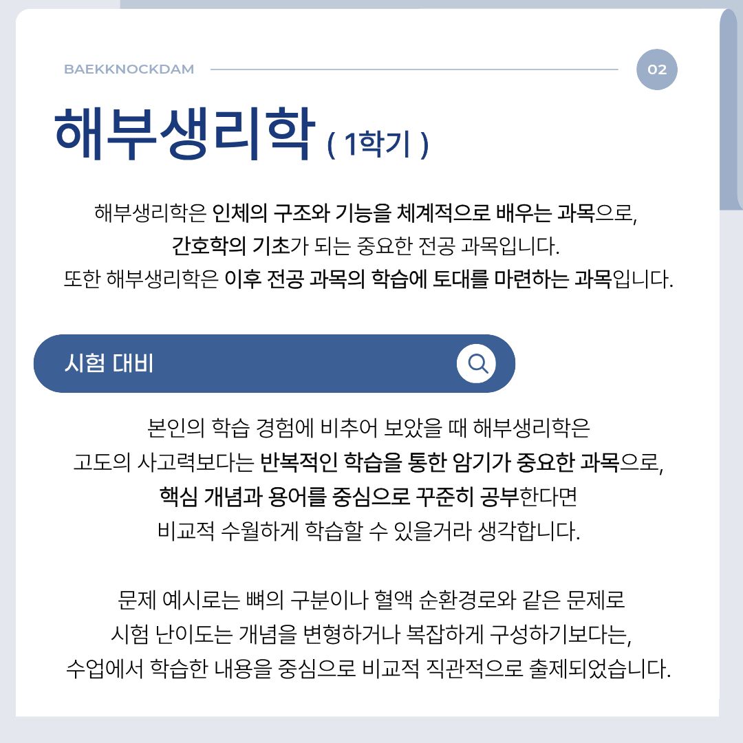 시험 대비 측면에서 보았을 때, 해부생리학은 고도의 사고력이나 추론 능력을 요구하기보다는 반복적인 학습을 통한 암기가 중요한 과목이라고 생각합니다. 따라서 핵심 개념과 용어를 중심으로 꾸준히 암기 학습을 진행한다면 비교적 수월하게 공부할 수 있을 것입니다. 본인의 경우 담당 교수님께서 강의 자료인 PPT 내용을 중심으로 문제를 출제하셔서 시험 준비에 대한 부담이 상대적으로 적었습니다. 이와 함께 각 과목 담당 교수님의 출제 경향을 미리 파악해 두는 것 또한 학습 전략을 세우는 데 도움이 될 수 있습니다.