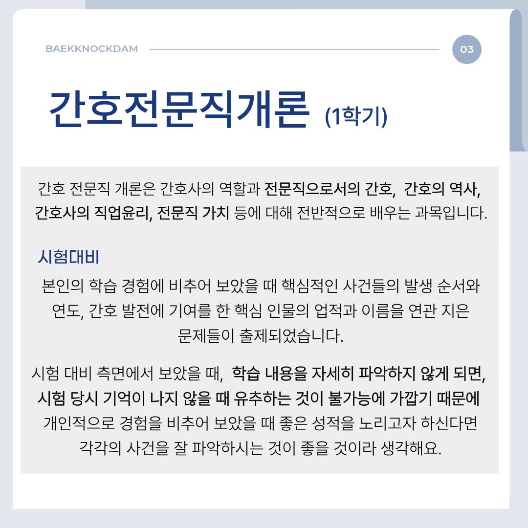 간호 전문직 개론은 간호사의 역할과 전문직으로서의 간호에 대해 전반적으로 배우는 과목입니다. 간호의 역사, 간호사의 직업윤리, 전문직 가치 등을 통해 예비 간호사로서의 정체성을 형성하는 데 도움을 줍니다. 간호학과 생활의 방향성을 잡아주는 과목이라 할 수 있으며 간호사 직업의 윤리는 이후 2학기에 수강하게 될 간호 윤리와 연관됩니다.