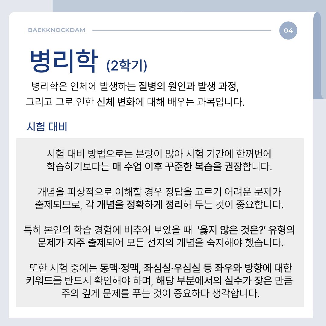 병리학은 인체에 발생하는 질병의 원인과 발생 과정, 그리고 그로 인한 신체 변화에 대해 배우는 과목입니다. 정상 상태에서 벗어난 인체의 변화를 이해함으로써 질병을 보다 논리적으로 바라볼 수 있게 만들어주는 과목입니다.