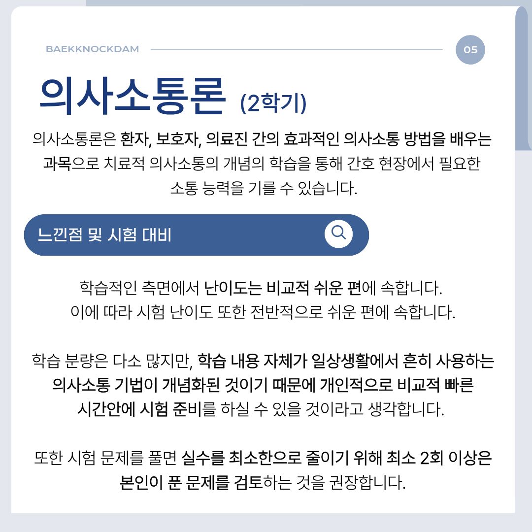 학습적인 측면에선 난이도가 굉장히 쉬운 편에 속합니다. 이에 따라 시험 난이도도 나름 쉬운 편에 속하는데요, 그렇기 때문에 약간의 실수에도 등수가 급속도로 떨어지기도 하는 과목입니다. 시험 문제를 풀면 실수를 최소한으로 줄이기 위해 최소 2회 이상은 본인이 푼 문제를 검토하는 것을 추천해 드립니다. 학습 분량은 다소 많은 편이긴 하나 학습 내용 자체가 1학기 간호학과 필수 교양으로 듣게 될 ‘인간 심리와 행동’ 과 중복되는 내용이 있으며 일상생활에서 흔히 사용하는 의사소통 기법이 개념화된 것이기 때문에 비교적 빠른 시간안에 시험 준비를 하실 수 있을 것입니다.
