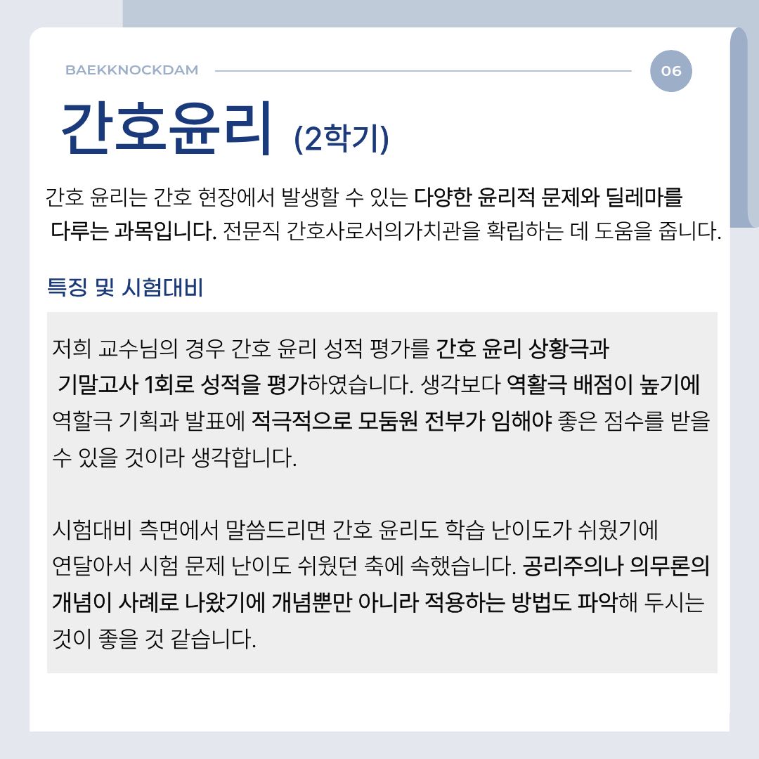 간호 윤리는 간호 현장에서 발생할 수 있는 다양한 윤리적 문제와 딜레마를 다루는 과목입니다. 윤리 원칙과 사례 분석을 통해 올바른 판단과 책임 있는 간호 실천에 대해 고민하는 시간을 가질 수 있으며, 전문직 간호사로서의 가치관을 확립하는 데 도움을 줍니다.