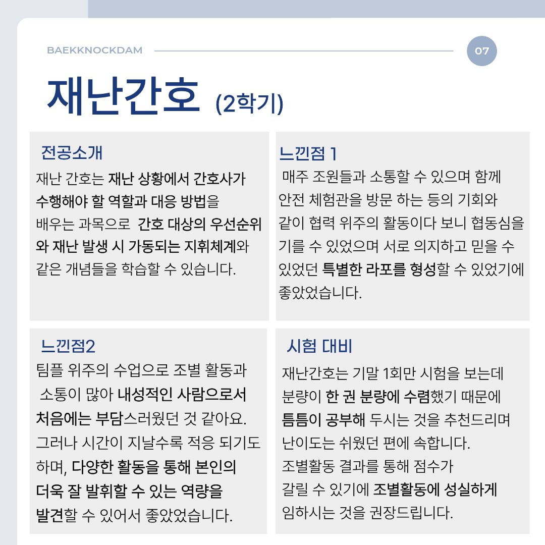 시험 대비 측면에서 보자면, 재난간호는 기말 1회만 시험을 보는데 분량이 한 권 분량에 수렴했기 때문에 기말고사 기간 몰아서 공부하기보다는 중간고사 기간이 지나면 틈틈이 공부해 두시는 것을 추천해 드려요.