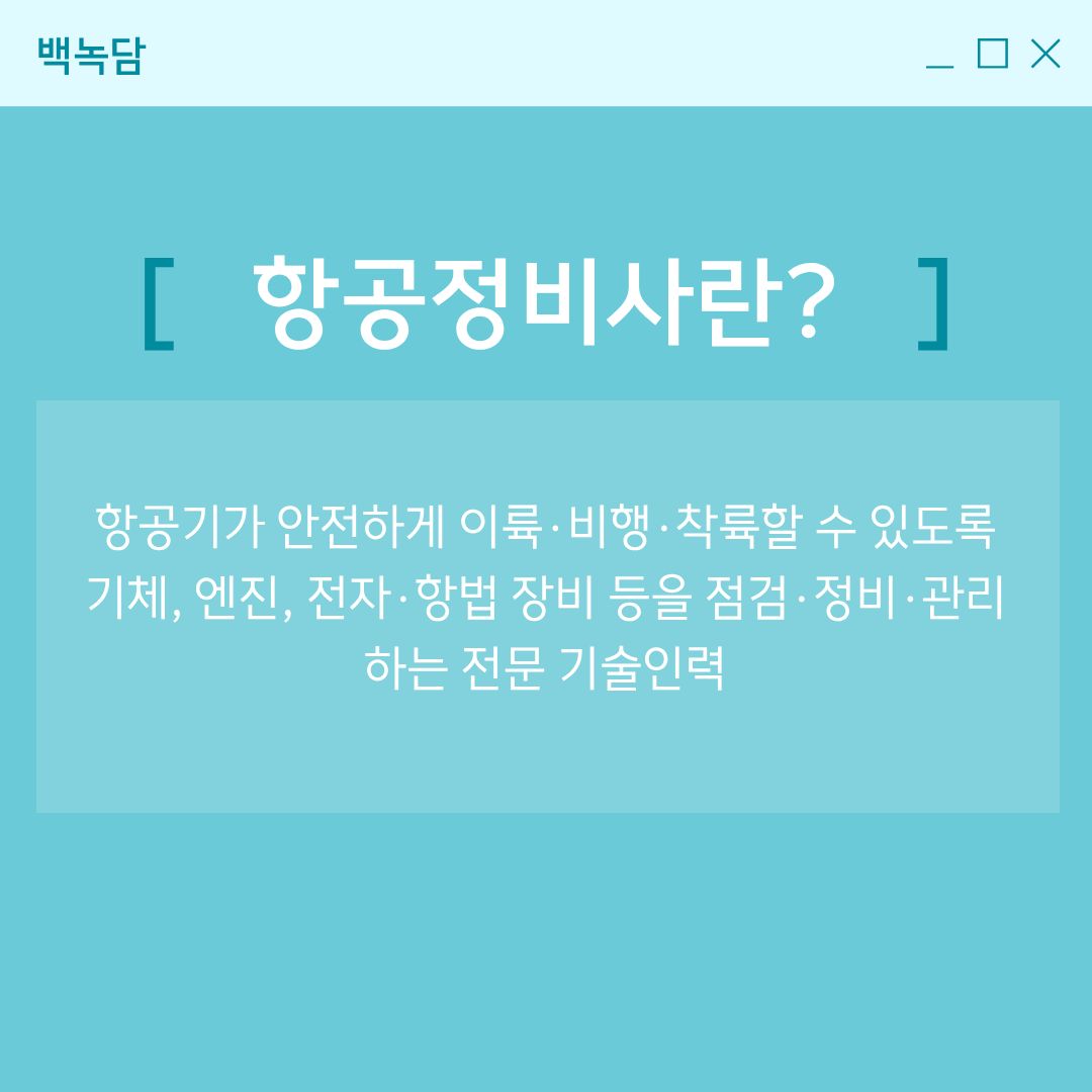 항공정비사는 항공기가 최상의 상태에서 안전하게 비행할 수 있도록 기체, 엔진, 전자 및 항법 장비 등을 점검하고 정비하며 관리하는 전문 기술 인력입니다. 수백 명의 승객이 탑승하는 항공기는 아주 작은 결함으로도 대형 사고로 이어질 수 있기 때문에, 항공정비사의 손끝에는 승객의 생명과 직결되는 막중한 책임감이 담겨 있습니다.