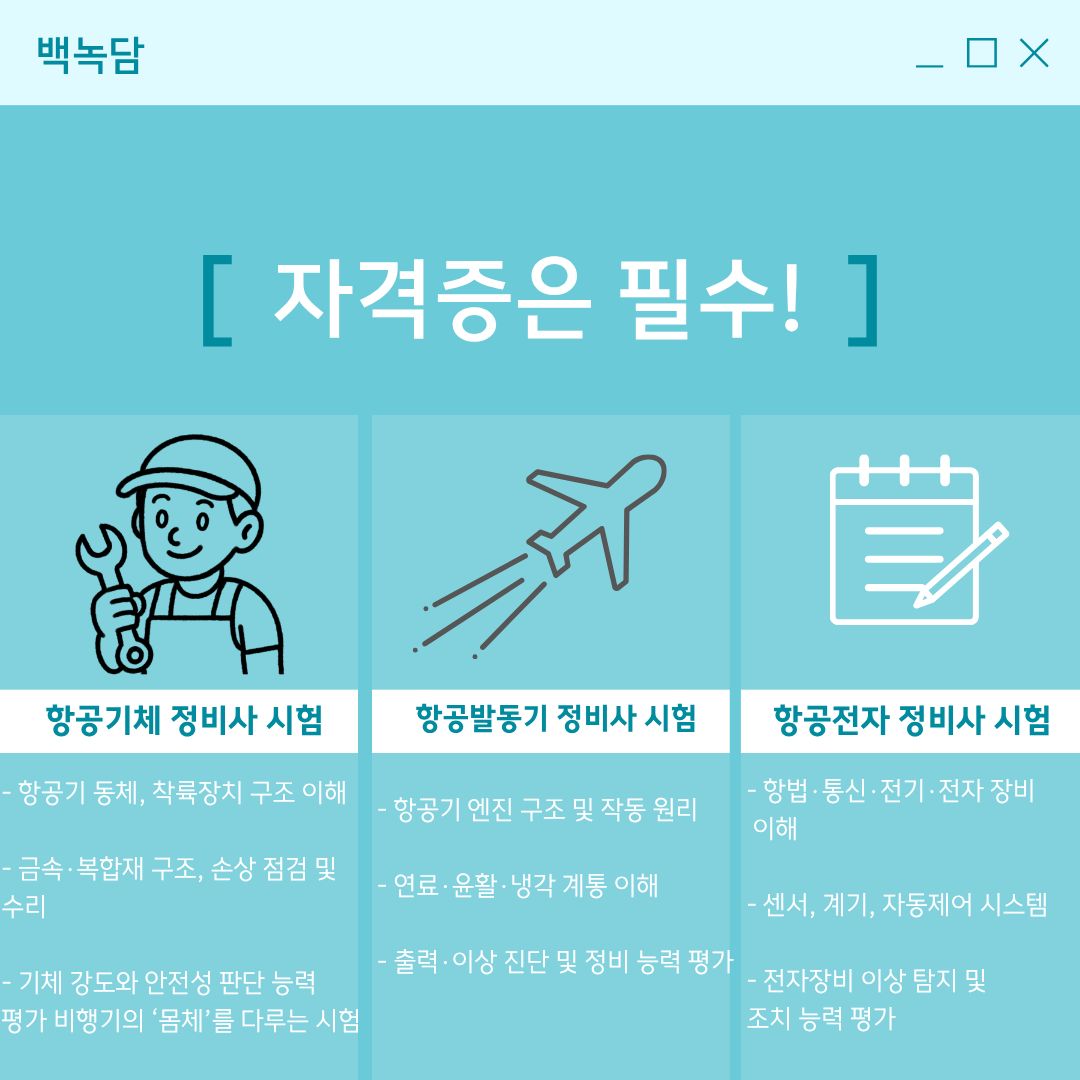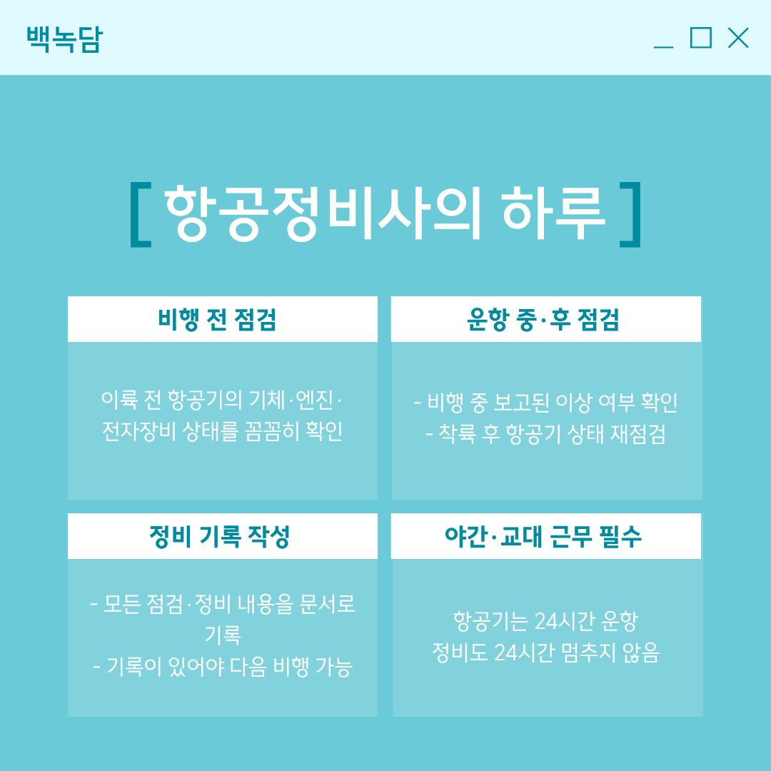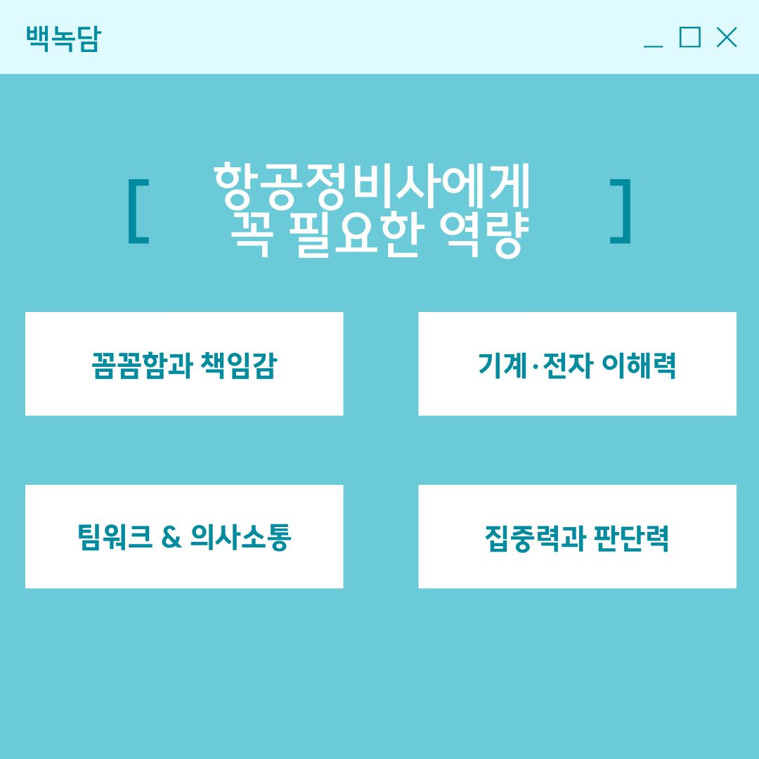 항공정비사가 되기 위해서는 고도의 전문성과 세심한 성격이 요구됩니다. 카드뉴스에서 강조하듯 **'꼼꼼함과 책임감'**은 가장 기본적인 덕목입니다. 기계와 전자에 대한 깊은 이해력은 물론, 복잡한 매뉴얼을 정확히 해석하고 적용할 수 있는 능력이 필요합니다. 또한, 정비는 혼자 하는 작업이 아니기에 팀워크와 원활한 의사소통 능력, 긴급 상황에서의 집중력과 판단력이 당락을 결정짓는 요소가 됩니다.