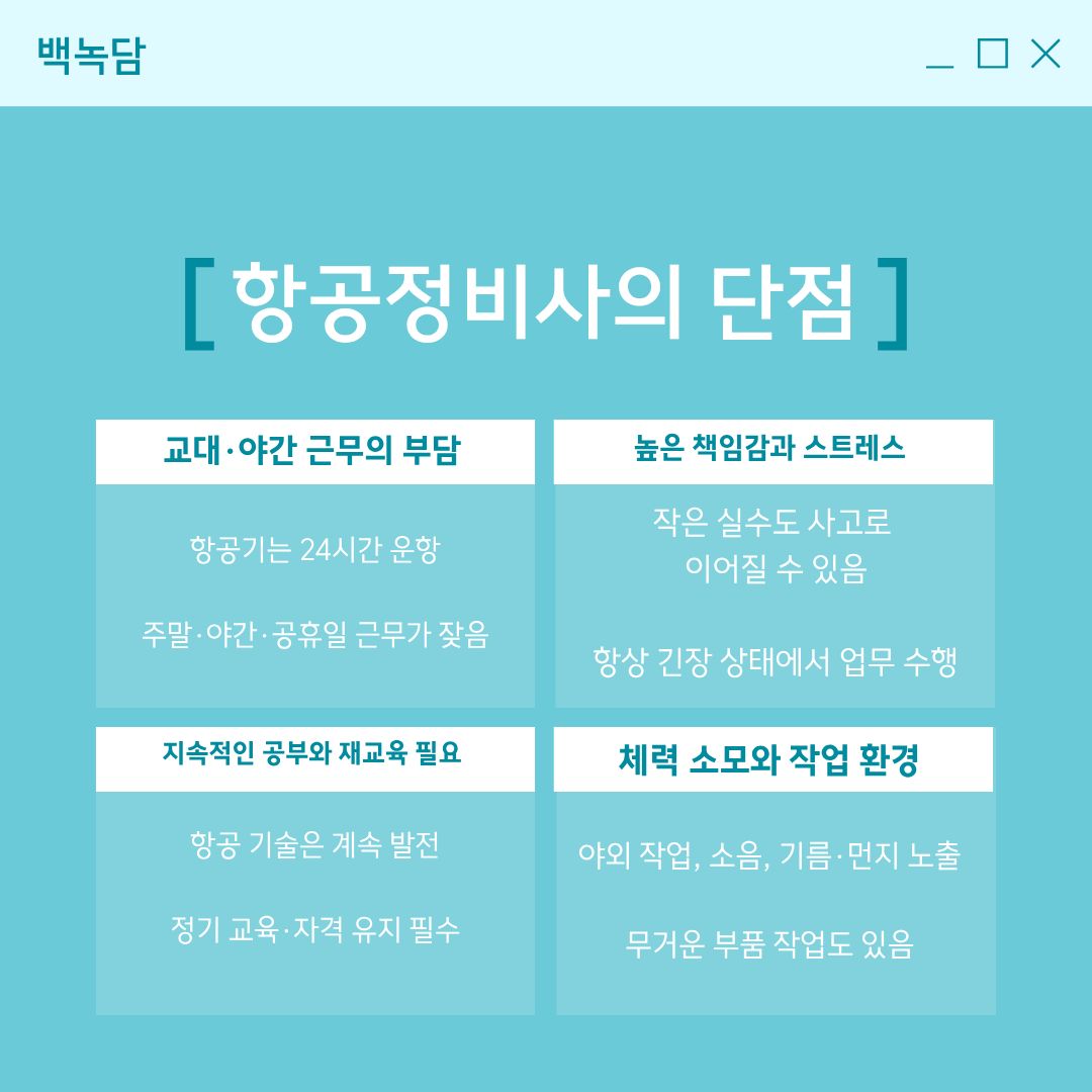 하지만 화려한 면만 있는 것은 아닙니다. 24시간 돌아가는 항공 스케줄에 맞춘 야간·교대 근무는 체력적으로 큰 부담이 되며, 기름과 먼지, 소음이 가득한 현장에서 무거운 부품을 다뤄야 하는 작업 환경은 결코 녹록지 않습니다. 또한, 아주 작은 실수가 대형 사고로 이어질 수 있다는 압박감은 높은 스트레스 요인이 되기도 합니다. 따라서 끊임없이 발전하는 항공 기술에 발맞춰 지속적으로 공부하고 자격을 유지하려는 자기계발 의지가 필수적입니다.