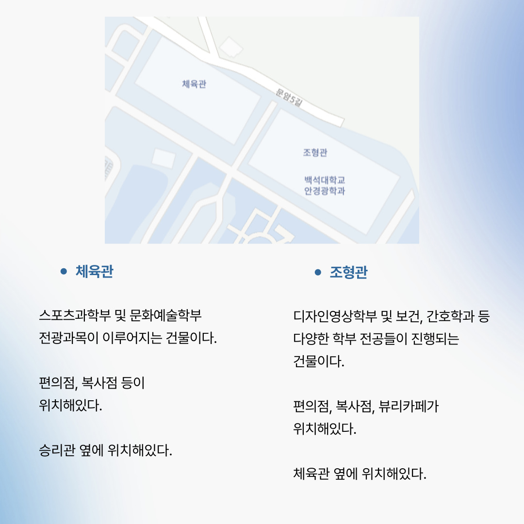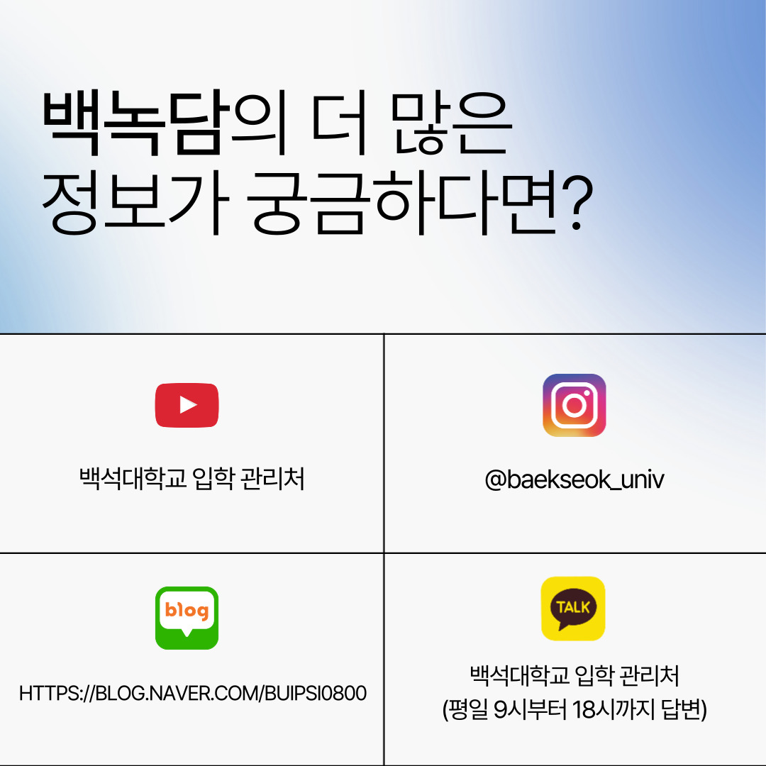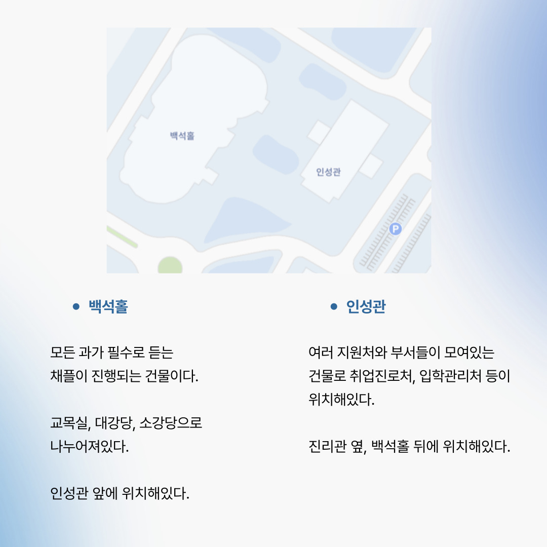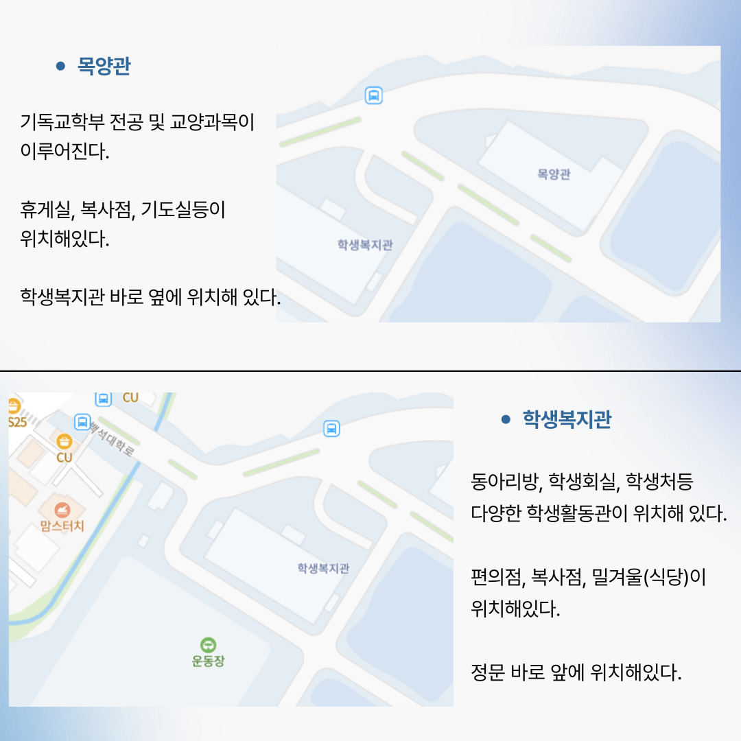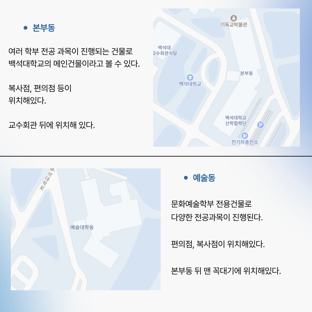 이렇게 백석대학교 건물에 대해 알아보았는 데 도움이 되셨을까요? 새내기 학생들이 이 기사를 통해 조금이나마 빠르게 학교에 적응해 즐거운 교내 생활을 이어가셨으면 좋겠습니다!