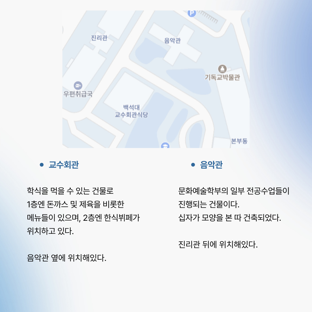 다음으로는 교수회관 및 음악관에 대해 소개해 드리겠습니다.