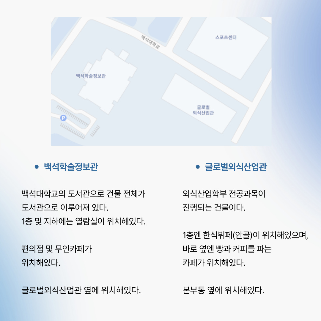 다음으로는 백석학술정보관과 글로벌외식산업관에 대해 소개하겠습니다.
