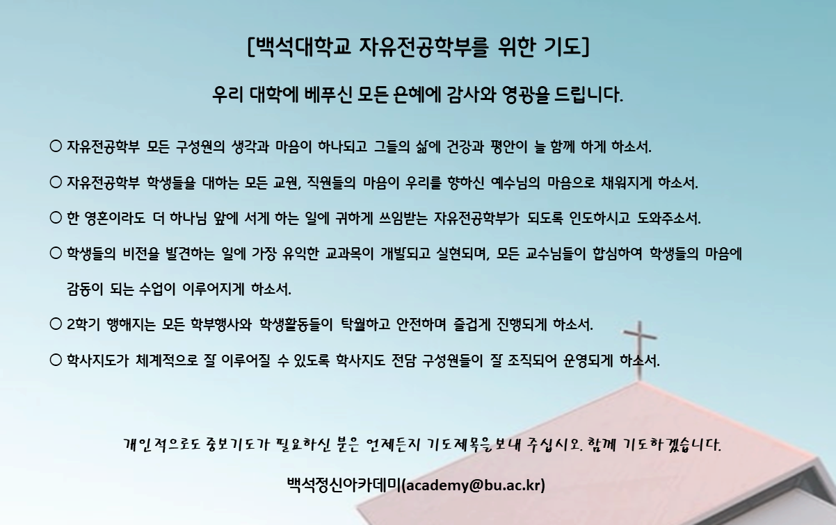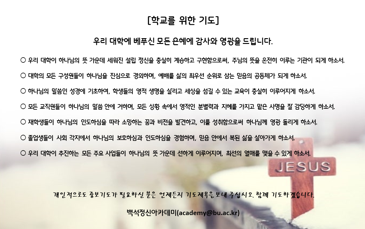 fnctId=mainNotice,fnctNo=0 글번호 52185 작성일 2025.11.07 작성자 백석정신아카데미 조회수 410 우리대학과 학부를 위한 기도입니다. 함께 기도해 주세요.